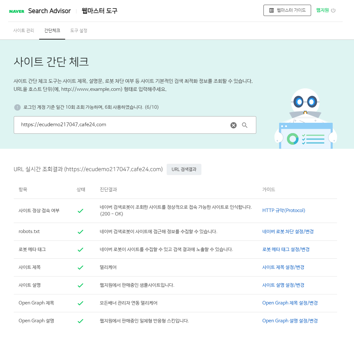 | [카페24 매뉴얼] 네이버 웹마스터도구에 "검색로봇, 사이트 설명" 설정 방법 (0) | 2022.03.16 |